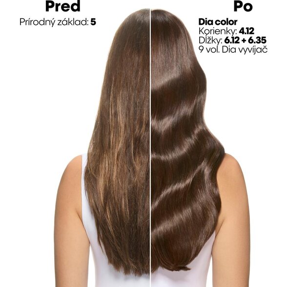 6VOL 1,8% - Pro přirozenější barevný výsledek (jemnější ukládání barvy) použijte Dia vyvíječ o síle 6 vol. Je ideální pro klienty, kteří chtějí vypadat přirozeně s co nejmenším barevným závazkem.