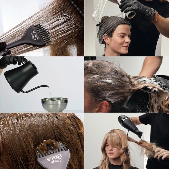 Po smíchání vznikne hladká krémová konzistence. Barva se může aplikovat na čisté suché vlasy (např. při krytí šedin) nebo na umyté, vlhké vlasy podle typu služby. Pro intenzivnější tón nebo silnější krytí je možné dobu působení prodloužit přibližně o 10 minut.