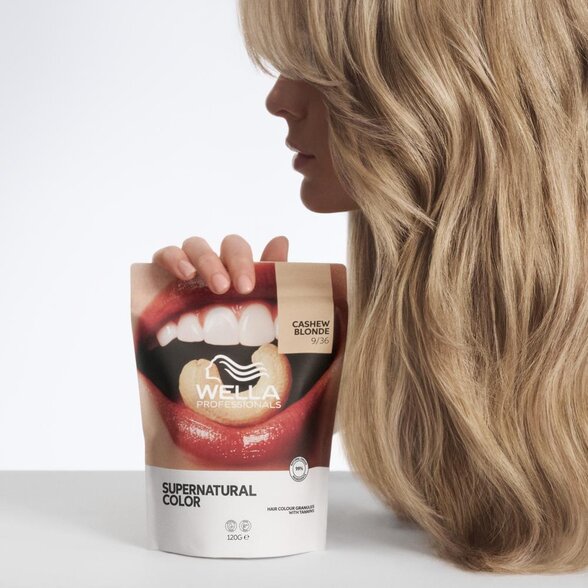 Wella Professionals Supernatural Color 9/36 Cashew Blonde představuje moderní přírodní barvu na blond vlasy, která spojuje sílu rostlinných složek s precizní technologií salónní kvality. Díky vysokému podílu ingrediencí přírodního původu a veganskému složení nabízí šetrné, no zároveň spolehlivé řešení pro klientky, které chtějí krásnou blond bez kompromisů.