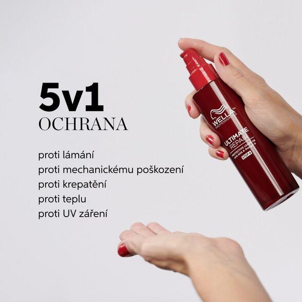 Bezoplachový termooochranný sprej na vlasy chrání proti 4 nejčastějším příčinám poškození a zároveň omezuje krepatění. Wella Professionals Ultimate Repair Protective Leave In se díky mléčné konsistenci dobře zapracovává a dělá vlasy viditelně hladší, zdravější a poddajnější. Sprej je vhodný pro všechny typy vlasů včetně kudrnatých.